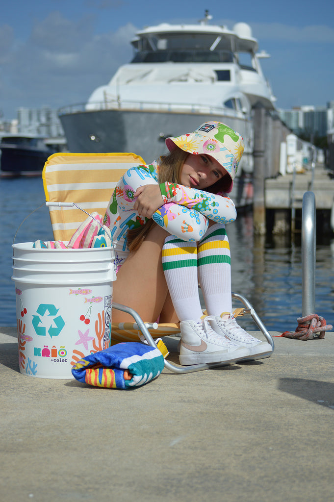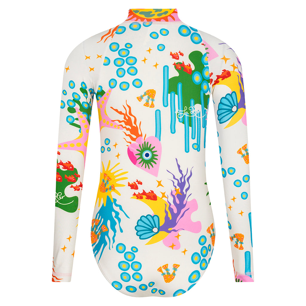 Nuestro nuevo vestido entero de baño manga larga "Pélican Marin" es perfecto para las niñas activas y a la moda. Los vestidos de baño con protección UV son hechos de tela suave, de poliéster reciclado, de fácil secado y con protección solar UPF 50+ este vestido de baño de una pieza es perfecto para los días soleados, para nadar, bucear, hacer paddle boarding. Hechos para usarlos días enteros en la playa, este vestido de baño de niñas para surfear con pescados y corales contrasta con una cremallera frontal.