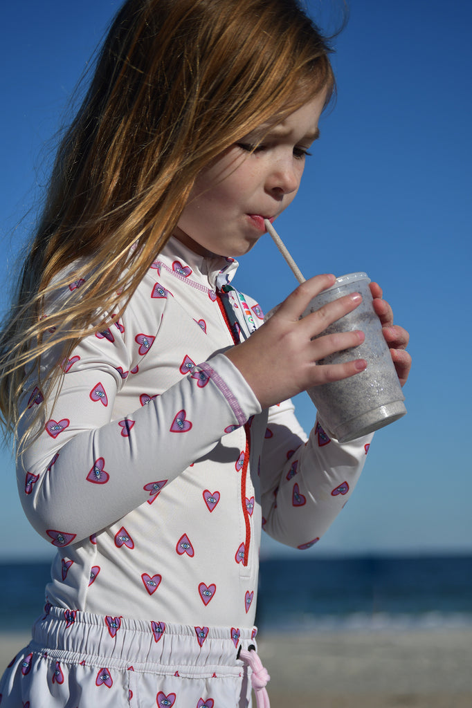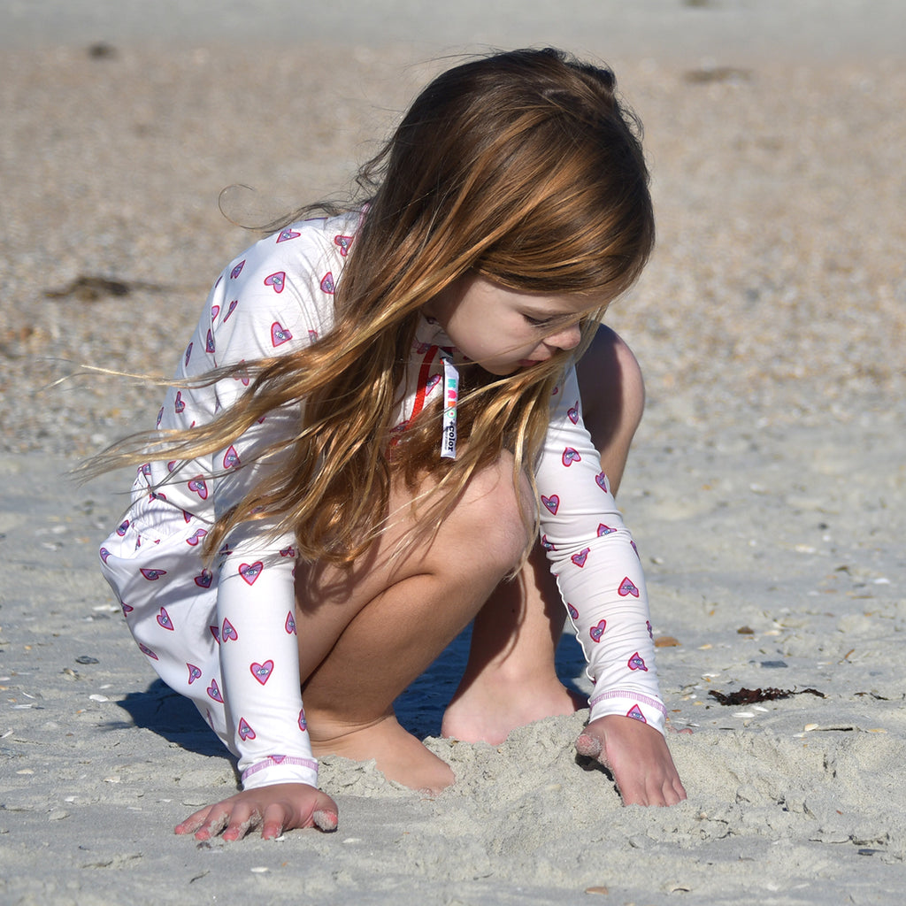 Nuestro nuevo vestido entero de baño manga larga "Hearts" es perfecto para las niñas activas y a la moda. Los vestidos de baño con protección UV son hechos de tela suave, de poliéster reciclado, de fácil secado y con protección solar UPF 50+ este vestido de baño de una pieza es perfecto para los días soleados, para nadar, bucear, hacer paddle boarding. Hechos para usarlos días enteros en la playa, este vestido de baño de niñas para surfear con pescados y corales contrasta con una cremallera frontal.
